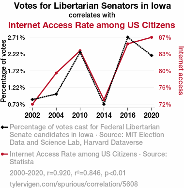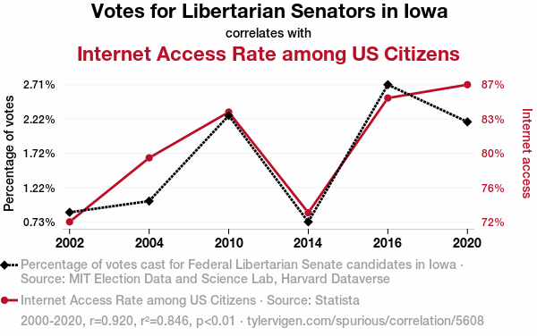 A linear line chart with years as the X-axis and two variables on the Y-axis. The first variable is Votes for Libertarian Senators in Iowa and the second variable is Internet Access Rate among US Citizens.  The chart goes from 2000 to 2020, and the two variables track closely in value over that time. Small Image