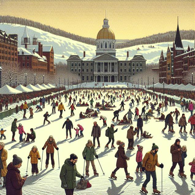 Prompt: Prompt: Generate an image in the style of a TIME magazine cover depicting a bustling snowy park in Manchester, New Hampshire. Show people engaging in outdoor activities like ice skating and snowshoeing on a bright, clear day, capturing the joyous atmosphere. Amidst the lively scene, subtly convey the unintentional spread of the flu as people check their phones. Focus on the contrast between the vibrant outdoor fun and the hidden threat of illness. The depiction should include only scenes, people, and objects, it should not include text or speech bubbles.