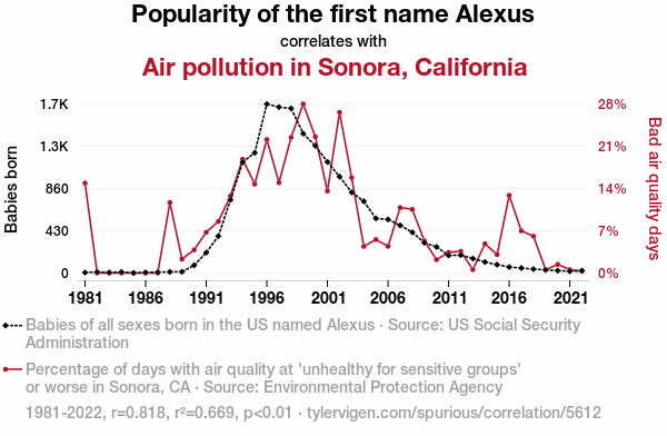 A linear line chart with years as the X-axis and two variables on the Y-axis. The first variable is Popularity of the first name Alexus and the second variable is Air pollution in Sonora, California.  The chart goes from 1981 to 2022, and the two variables track closely in value over that time. Small Image