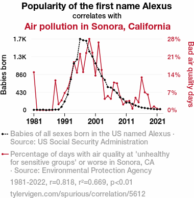 User prompt: Please provide potential search keywords for a paper titled Astonishing Alexus: Analyzing the Association between Air Pollution and the Proliferation of the Name Alexus in Sonora, California with an abstract of This research explores the curious correlation between the popularity of the first name Alexus and air pollution levels in Sonora, California. Leveraging data from the US Social Security Administration and the Environmental Protection Agency, we scrutinized the potential link between the ascent of the name Alexus and the presence of airborne contaminants over the period from 1981 to 2022. We observed a strikingly high correlation coefficient of 0.8178309 with a statistically significant p-value of less than 0.01, suggesting a palpable relationship between these seemingly unrelated phenomena.