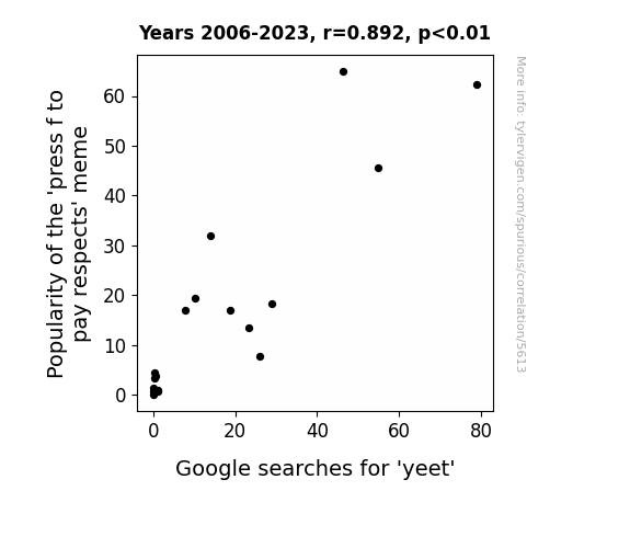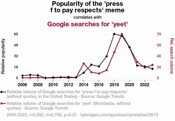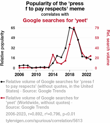 - The spurious research paper: Press F to Pay Respects: A Yeet-y Relationship Between Meme Popularity and Google Searches