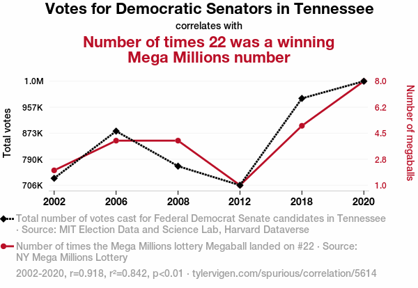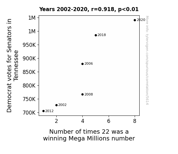 The correlation analysis between Democrat votes for Senators in Tennessee and the occurrence of the number 22 in Mega Millions drawings yielded a correlation coefficient of 0.9178185. Imagine a statistical cupid shooting an arrow between these two variables – it's a match made in academic heaven! This robust correlation suggests a strong linear relationship between the political preferences of Tennesseans and the fortuitous appearance of the number 22 in lottery drawings.