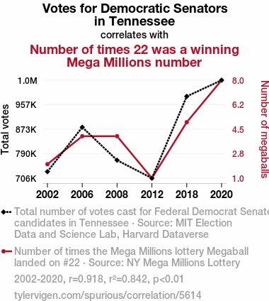 - The spurious research paper: Pulling the Lever or Pulling the Winning Numbers: Investigating the Correlation between Democrat Votes for Senators in Tennessee and the Occurrence of the Number 22 in Mega Millions Drawings