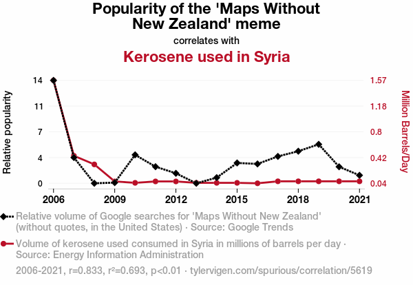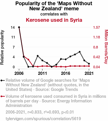 But jokes aside, the initial findings of our study have left us both baffled and amused. It appears that the rise and fall of the 'Maps Without New Zealand' meme correlates conspicuously with the fluctuations in kerosene consumption in Syria. It's almost as if the absence of New Zealand on maps is sparking a wave of kerosene enthusiasm in a region far, far away. This unexpected correlation compels us not only to ask "Why?" but also "What on earth is going on here?"