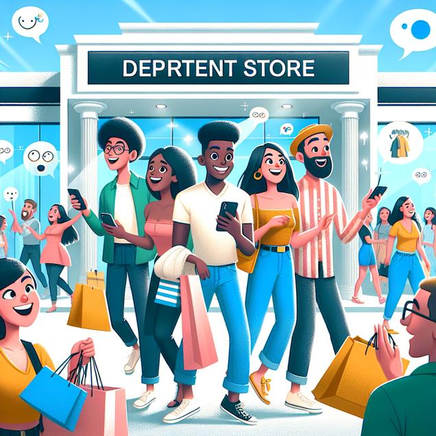 ChatGPT: A group of people leaving JCPenney with smiling faces, carrying bags of stylish and affordable items, while watching Casually Explained videos on their smartphones and laughing. The scene is full of relaxed and contented energy, as if the improved JCPenney experience has translated into a surge of joy while enjoying the casually informative content.