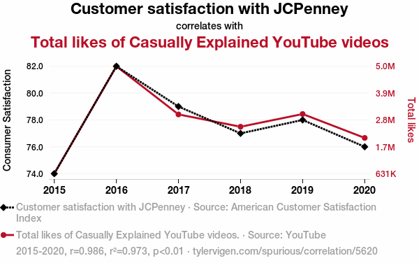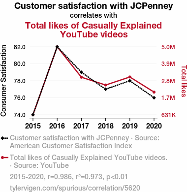 - The spurious research paper: From JCP to Jokes: Exploring the Relationship Between Customer Satisfaction at JCPenney and Total Likes of Casually Explained YouTube Videos