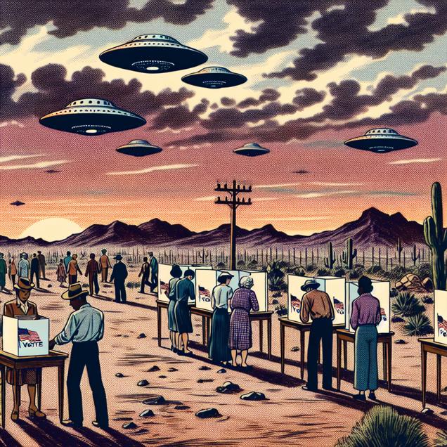Prompt: Generate a comic-book-style illustration set in the Nevada desert at dusk. The scene shows a polling station with a steady stream of people casting their votes for the Republican Presidential candidate. High above, a fleet of UFOs emerges in the twilight sky, their otherworldly glow casting an eerie light over the desert landscape. The juxtaposition of the political fervor and the arrival of extraterrestrial visitors creates a surreal and captivating visual, brought to life with muted colors and a classic dotted halftone pattern reminiscent of comic books from the 1960s. The depiction should include only scenes, people, and objects, it should not include text or speech bubbles.