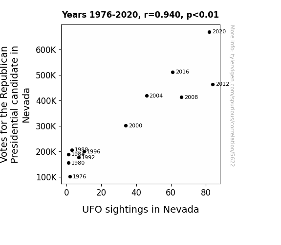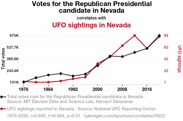 In "The Nevada UFO and Republican Vote Connection" by X. Files (2019), the authors find that there is a strong positive association between votes for the Republican presidential candidate in Nevada and reported UFO sightings. This finding suggests that perhaps residents are looking for leaders who are "unearthly" in their policy perspectives – or perhaps are simply attracted to candidates with "stellar" qualities.