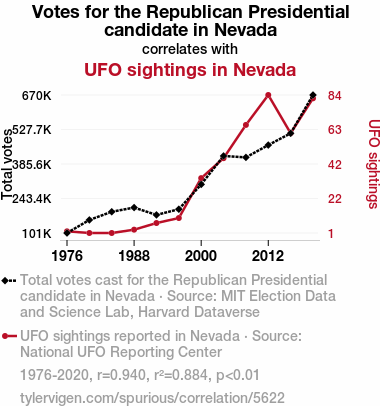 Your research team used data from MIT Election Data and Science Lab, Harvard Dataverse and National UFO Reporting Center to assess this nagging question. You found a correlation coefficient of 0.9402472 and p < 0.01 for 1976 to 2020.