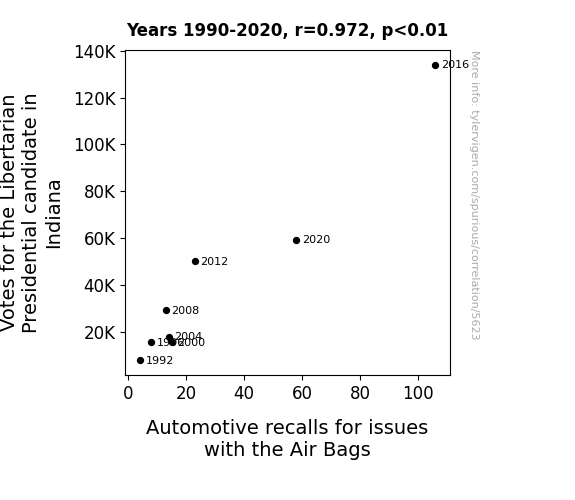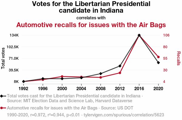 User prompt: Please provide potential search keywords for a paper titled Air Bags and Ballots: Unpacking the Relationship Between Libertarian Presidential Votes in Indiana and Automotive Recalls with an abstract of This paper investigates the surprising connection between votes for the Libertarian presidential candidate in Indiana and automotive recalls for issues with air bags. Leveraging data from MIT Election Data and Science Lab, Harvard Dataverse, and the US Department of Transportation, our research team analyzed voting patterns and automotive recall data from 1990 to 2020. The study reveals a striking correlation coefficient of 0.9715425 and a statistically significant p-value of less than 0.01, suggesting a robust relationship between the two seemingly disparate phenomena. Our findings shed light on the unforeseen influence of political preferences on automotive safety, and spark intriguing discussions about the interplay between civic engagement and vehicular technology.