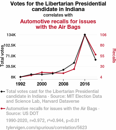 - The spurious research paper: Air Bags and Ballots: Unpacking the Relationship Between Libertarian Presidential Votes in Indiana and Automotive Recalls