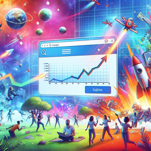 Prompt: Create an image where a digital screen displays a bustling search bar with "roblox" typed in, while a vibrant virtual world emerges in the background. Simultaneously, the screen exhibits a line graph depicting a rising trend in the average number of likes on Steve Mould's YouTube videos. The graph seems to connect the virtual world with real-world appreciation for science, blending the realms of online gaming and scientific acclaim. The depiction should include only scenes, people, and objects, it should not include text or speech bubbles.