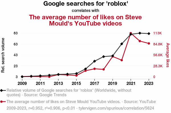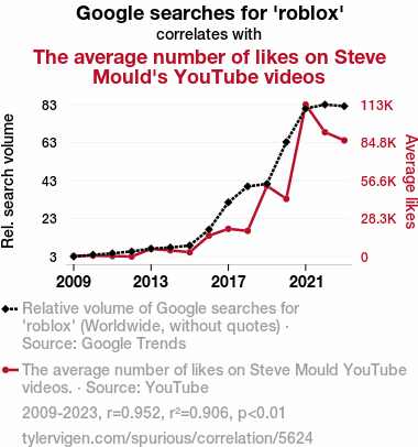 It's important to note that correlation does not imply causation, as any self-respecting researcher (or responsible parent) would remind you. So, while we can't definitively claim that 'Roblox' searches directly cause a surge in likes on Steve Mould's content, or vice versa, the correlation does raise eyebrows and piques our scientific curiosity. It's a bit like stumbling upon a mysterious locked door in a video game—there might be a thrilling discovery waiting behind it, but we'll need additional keys of evidence to unlock the secrets of this digital enigma.