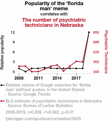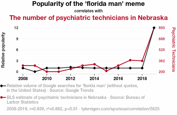 'Florida Man' meme, psychiatric technicians, Nebraska, correlation, Google Trends data, Bureau of Labor Statistics, statistical significance, meme impact, 'Florida Man' searches, employment trends, interconnected phenomena