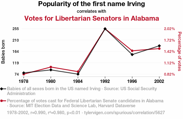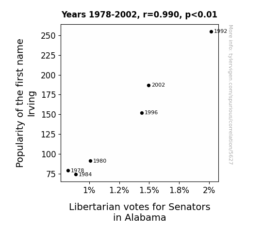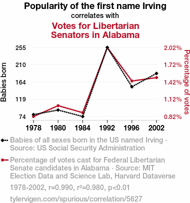 User prompt: Please provide potential search keywords for a paper titled Irving's Influence: A Popularity Poll on Libertarian Votes in Alabama with an abstract of In this study, we delve into the quirky realm of urban legends and political peculiarities as we explore the correlation between the popularity of the first name "Irving" and the libertarian votes for Senators in Alabama. Using a robust dataset from the US Social Security Administration and the MIT Election Data and Science Lab, Harvard Dataverse, we aimed to answer the burning question: Does the name "Irving" hold any sway over the voting trends in the political landscape of Alabama? Our findings reveal a staggering correlation coefficient of 0.9900687 and a significance level of p < 0.01 for the years spanning from 1978 to 2002, suggesting a surprisingly strong association between the two variables.