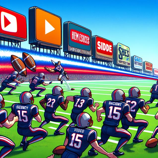 Prompt: Generate an image that conveys a sense of humor, featuring a football field with the New England Patriots playing in action. Each time they score a win, a giant ripple spreads across the field. Above the field, a row of YouTube video titles from SciShow Space transitions from being extremely geeky to more mainstream with each ripple, as if being influenced by the Patriots' performance. The visual should capture the excitement of the game and the unexpected influence it has on the video titles. The depiction should include only scenes, people, and objects, it should not include text or speech bubbles.
