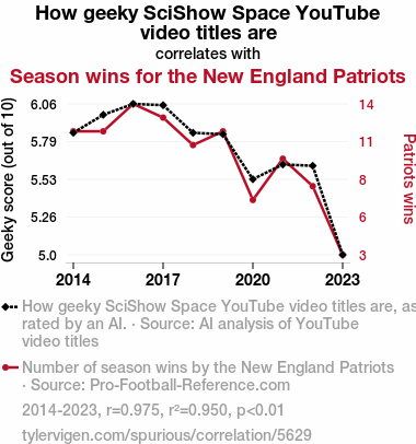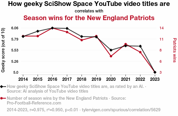 This means 95% of the change in the one variable (i.e., Season wins for the New England Patriots) is predictable based on the change in the other (i.e., How geeky SciShow Space YouTube video titles are) over the 10 years from 2014 through 2023.