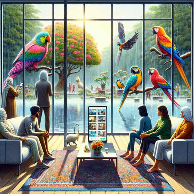 Prompt: Generate an image of a cybernetic art-style representation. It should depict a tranquil living room scene where several individuals are gathered around a large window. They are captivated by the sight of raindrops cascading against the glass outside. Outside, an assortment of vibrant, exotic birds seek refuge under a tree, attempting to evade the downpour. Additionally, in the living room, there is a tablet displaying a list of YouTube video titles from the channel Technology Connections, containing subtle and less conspicuous phrases such as "Understanding Old PC Hardware" and "Classic TV Technology Explained." The depiction should include only scenes, people, and objects, it should not include text or speech bubbles.