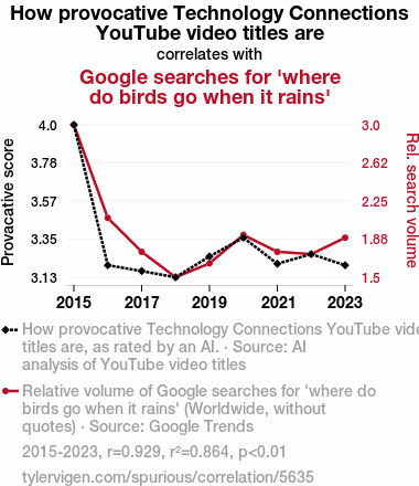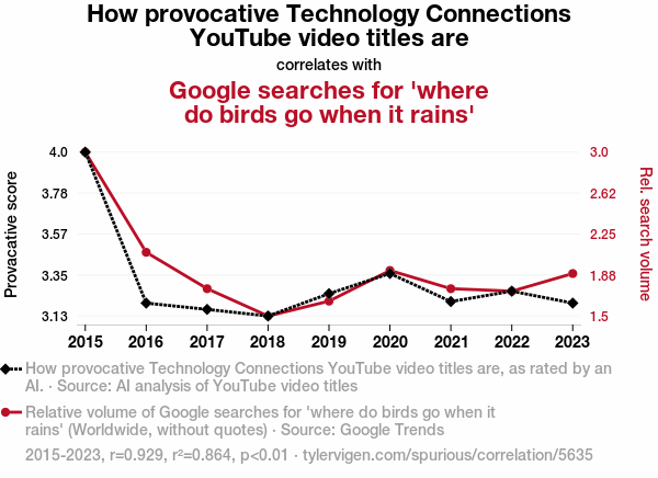 This means 86.4% of the change in the one variable (i.e., Google searches for 'where do birds go when it rains') is predictable based on the change in the other (i.e., How provocative Technology Connections YouTube video titles are) over the 9 years from 2015 through 2023.
