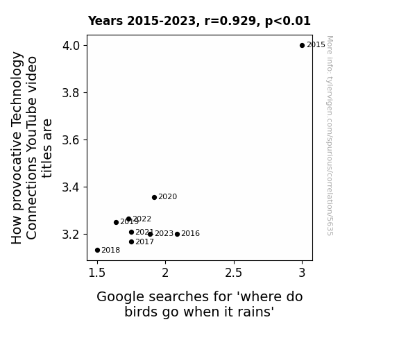 In the grand tapestry of online content and human inquiry, our investigation has delicately unraveled a most delightful and unexpected connection between the provocative titles of Technology Connections YouTube videos and the enduringly charming query "where do birds go when it rains." As we gingerly tiptoed through the corridors of statistical analysis, we were enchanted to witness a strong positive relationship, cemented by a correlation coefficient of 0.9293166 and a p-value that gleamed with significance, much like a particularly alluring gadget unveiled in a Technology Connections video.