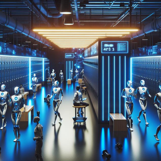 ChatGPT: Image Generation Prompt: Description: Show a bustling high-tech fitness center, with vibrant blue lighting illuminating the scene. The locker room attendants are depicted as sleek, futuristic robots, diligently organizing the lockers and tending to the needs of the gym-goers. The atmosphere exudes an atmosphere of technological efficiency and sophistication, symbolizing the surge in demand for their services driven by the Democratic wave. Capture the fusion of cutting-edge technology with the energetic ambiance of a busy fitness center, highlighting the newfound interest in post-vote workouts.
