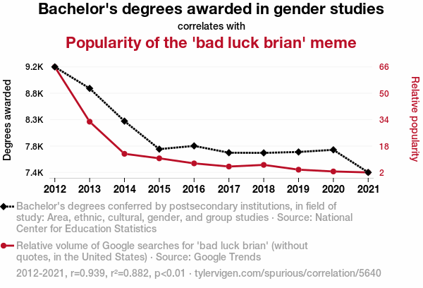 This means 88.2% of the change in the one variable (i.e., Popularity of the 'bad luck brian' meme) is predictable based on the change in the other (i.e., Bachelor's degrees awarded in gender studies) over the 10 years from 2012 through 2021.