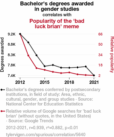 gender studies, Bachelor's degrees, bad luck brian, meme, internet memes, correlation coefficient, National Center for Education Statistics, Google Trends, gender studies degrees, internet culture, meme-tic analysis