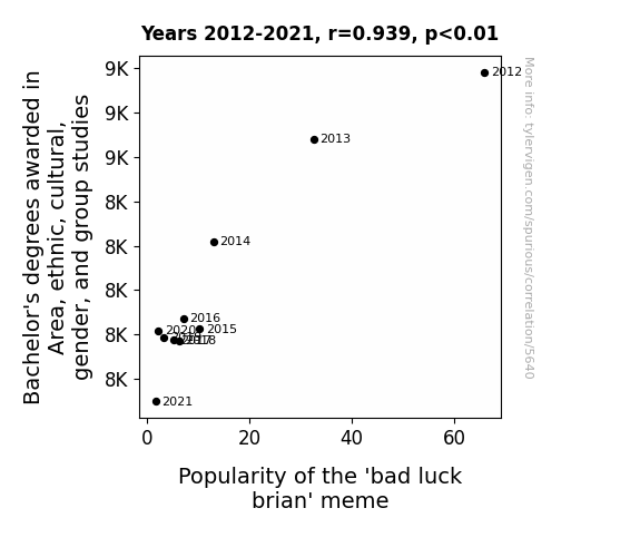 User prompt: Please make up a funny explanation for how a decrease in Bachelor's degrees awarded in Area, ethnic, cultural, gender, and group studies caused Popularity of the 'bad luck brian' meme to decrease. Add a funny one-liner at the end.
