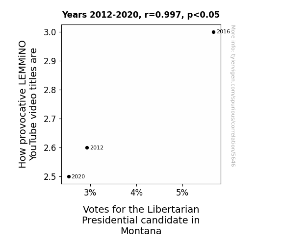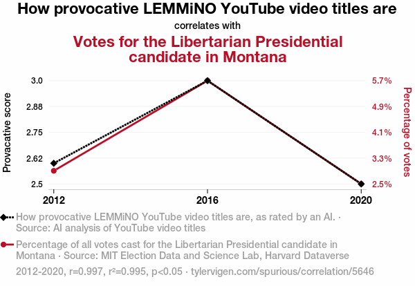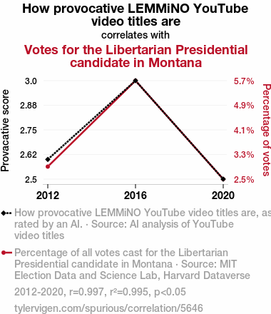 This means 99.5% of the change in the one variable (i.e., Votes for the Libertarian Presidential candidate in Montana) is predictable based on the change in the other (i.e., How provocative LEMMiNO YouTube video titles are) over the 3 years from 2012 through 2020.