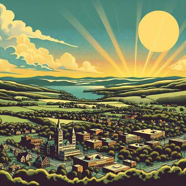 Prompt: [A comic-book-style illustration with bold lines, muted colors, and a dotted halftone pattern from the 1960s] The illustration shows Ithaca, a picturesque city with a clear sky and scenic landscapes. The sun shines down, casting a golden glow, and the buildings are highlighted in warm tones. The city is surrounded by nature, featuring fresh, clean air and lush greenery. In the background, the rest of the United States is depicted with a similar clear sky, symbolizing a sense of peace and safety. The overall image conveys a serene and idyllic atmosphere, reflecting the calming effect of the clean, clear air on both Ithaca and the nation. The depiction should include only scenes, people, and objects, it should not include text or speech bubbles.