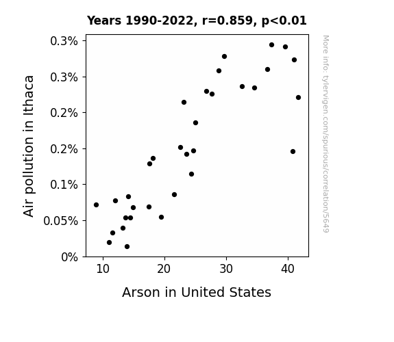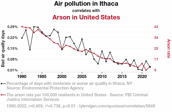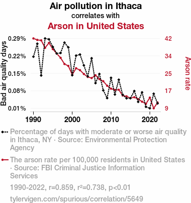- The spurious research paper: Clearing the Air: An Examination of the Relationship Between Air Pollution in Ithaca and Arson in the United States