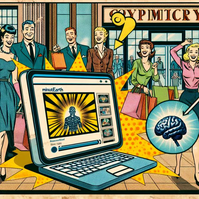 ChatGPT: [DALLE-3 prompt: A comic-book-style illustration with muted colors and a dotted halftone pattern from the 1960s] Generate a scene in a comic-book-style illustration with muted colors and a dotted halftone pattern from the 1960s. The scene features a laptop screen showing a MinuteEarth video with a flashy clickbait title that reads "Unbelievable Secrets About Earth! You Won't Believe #5!" The laptop screen is surrounded by an array of dots and lines, emphasizing its digital nature. In the background, a group of smiling customers leaving Macy's with bags in hand, clearly content and satisfied with their shopping experience. The two visuals are connected by a subtle brain-shaped icon hovering between them, hinting at the subconscious link between the clickbait titles and positive feelings towards Macy's. The overall visual depiction is simple, without any words or speech bubbles.