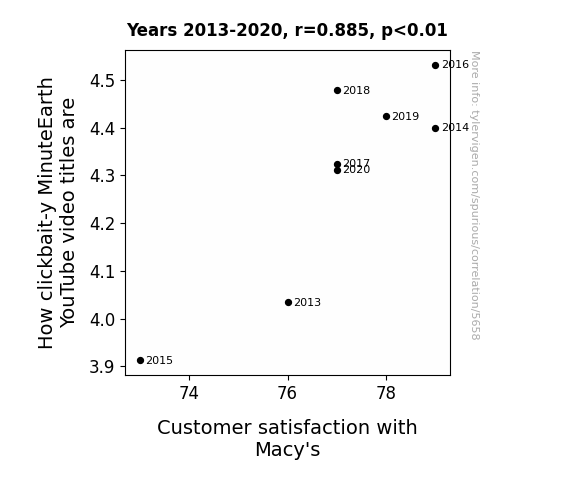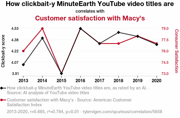 This means 78.4% of the change in the one variable (i.e., Customer satisfaction with Macy's) is predictable based on the change in the other (i.e., How clickbait-y MinuteEarth YouTube video titles are) over the 8 years from 2013 through 2020.
