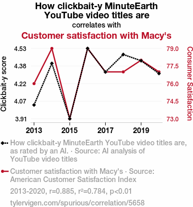 User prompt: Please make up a funny explanation for how an increase in How clickbait-y MinuteEarth YouTube video titles are caused Customer satisfaction with Macy's to increase.