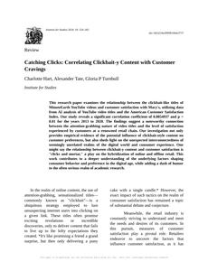 User prompt: Please provide potential search keywords for a paper titled Catching Clicks: Correlating Clickbait-y Content with Customer Cravings with an abstract of This research paper examines the relationship between the clickbait-like titles of MinuteEarth YouTube videos and customer satisfaction with Macy's, utilizing data from AI analysis of YouTube video titles and the American Customer Satisfaction Index. Our study reveals a significant correlation coefficient of 0.8854937 and p < 0.01 for the years 2013 to 2020. The findings suggest a noteworthy connection between the attention-grabbing nature of video titles and the level of satisfaction experienced by customers at a renowned retail chain.