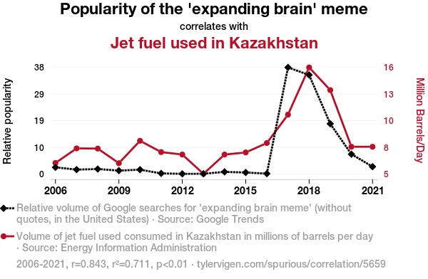 A linear line chart with years as the X-axis and two variables on the Y-axis. The first variable is Popularity of the 'expanding brain' meme and the second variable is Jet fuel used in Kazakhstan.  The chart goes from 2006 to 2021, and the two variables track closely in value over that time. Small Image