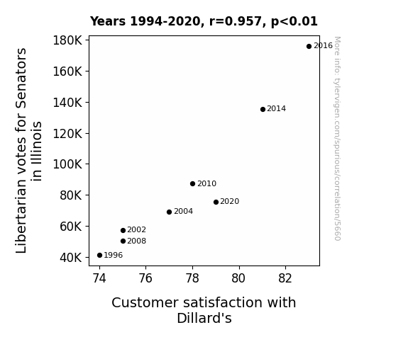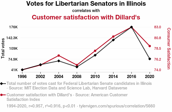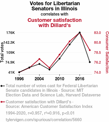 - The spurious research paper: Vote Libertarian, Feel Delightful: The Bizarre Link Between Illinois Senatorial Preferences and Dillard's Customer Satisfaction