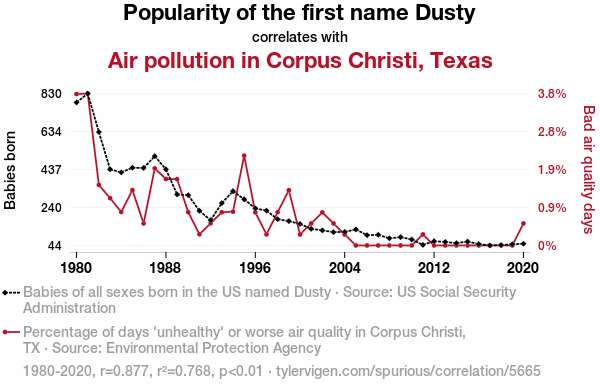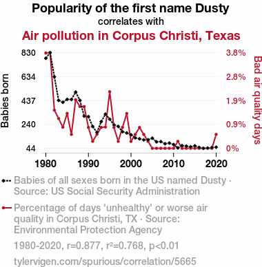 This means 76.8% of the change in the one variable (i.e., Air pollution in Corpus Christi, Texas) is predictable based on the change in the other (i.e., Popularity of the first name Dusty) over the 41 years from 1980 through 2020.