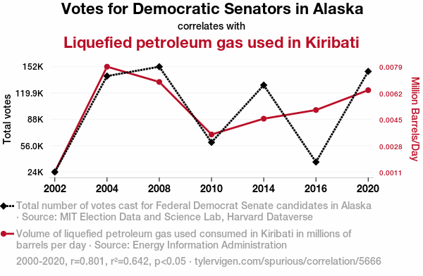 A linear line chart with years as the X-axis and two variables on the Y-axis. The first variable is Votes for Democratic Senators in Alaska and the second variable is Liquefied petroleum gas used in Kiribati.  The chart goes from 2000 to 2020, and the two variables track closely in value over that time. Small Image
