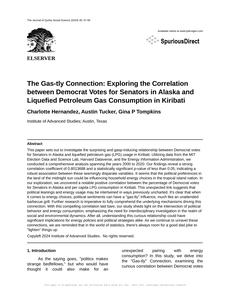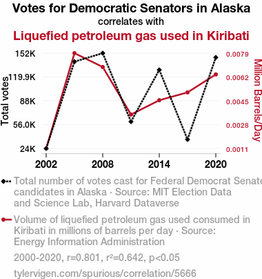 User prompt: Please provide potential search keywords for a paper titled The Gas-tly Connection: Exploring the Correlation between Democrat Votes for Senators in Alaska and Liquefied Petroleum Gas Consumption in Kiribati with an abstract of This paper sets out to investigate the surprising and gasp-inducing relationship between Democrat votes for Senators in Alaska and liquefied petroleum gas (LPG) usage in Kiribati. Utilizing data from the MIT Election Data and Science Lab, Harvard Dataverse, and the Energy Information Administration, we conducted a comprehensive analysis spanning the years 2000 to 2020. Our findings reveal a strong correlation coefficient of 0.8013688 and a statistically significant p-value of less than 0.05, indicating a robust association between these seemingly disparate variables. It seems that the political preferences in the land of the midnight sun could be influencing household energy choices in the tropical island nation.