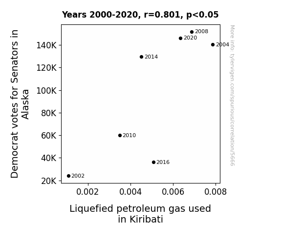 The analysis of the data spanning from 2000 to 2020 revealed a noteworthy correlation coefficient of 0.8013688 between Democrat votes for Senators in Alaska and liquefied petroleum gas (LPG) consumption in Kiribati. This correlation, indicated by an r-squared of 0.6421919 and a p-value of less than 0.05, suggests a robust and significant relationship between these seemingly unrelated variables. It seems that the political spectrum in the land of the midnight sun might be leaving a "fuel"ly impression on household energy choices in the tropical island nation, much like a strong barbeque aroma wafting through the air.