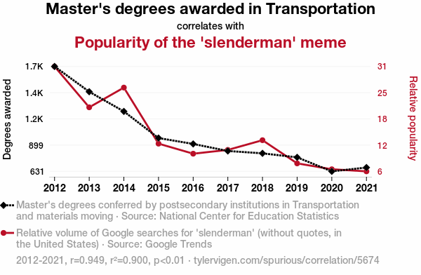 Slenderman meme, transportation-related Master's degrees, academic research, correlation coefficient, Google Trends, National Center for Education Statistics, meme phenomenon, scholarly expedition