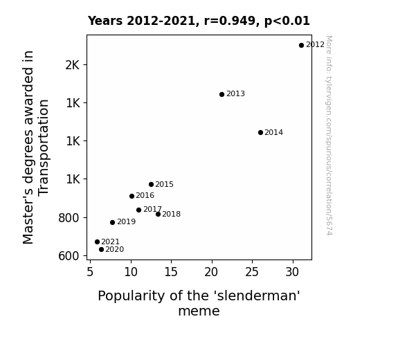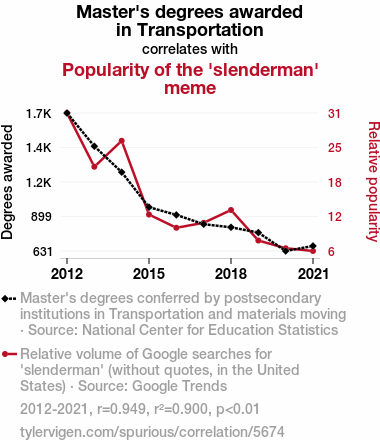 This means 90% of the change in the one variable (i.e., Popularity of the 'slenderman' meme) is predictable based on the change in the other (i.e., Master's degrees awarded in Transportation) over the 10 years from 2012 through 2021.