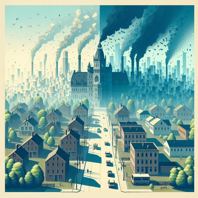 ChatGPT: Generate an image of a low-polygonal scene in St. Marys, Pennsylvania, with buildings and streets. The town should be transitioning from a polluted, smog-covered atmosphere to clear, blue skies. Show the dispersion of smog particles and the disappearance of shadowy figures who represent the would-be arsonist's accomplices. The image should also suggest a decrease in arson rates across the United States due to the absence of their natural partners in crime, as the polluted air, their potential fuel, is no longer present.