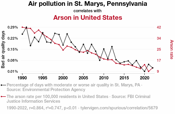 This means 74.7% of the change in the one variable (i.e., Arson in United States) is predictable based on the change in the other (i.e., Air pollution in St. Marys, Pennsylvania) over the 33 years from 1990 through 2022.