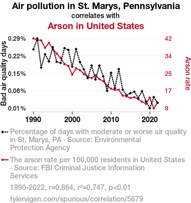 User prompt: Please make up a funny explanation for how a decrease in Air pollution in St. Marys, Pennsylvania caused Arson in United States to decrease.