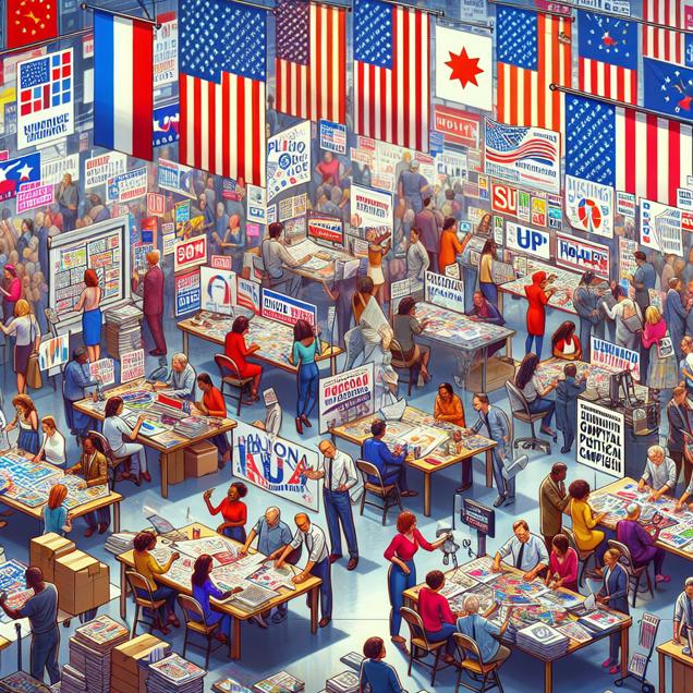 Prompt: Prompt: Generate an image in the style of a popular meme from Reddit, illustrating a wave of graphic designers flooding the job market in Indiana due to a surge in Republican votes. Show vibrant and eye-catching political campaign materials being designed and produced, reflecting the evolving political landscape in the state. The image should capture the energetic and lively atmosphere as design creativity meets political fervor in Indiana. The depiction should include only scenes, people, and objects, it should not include text or speech bubbles.