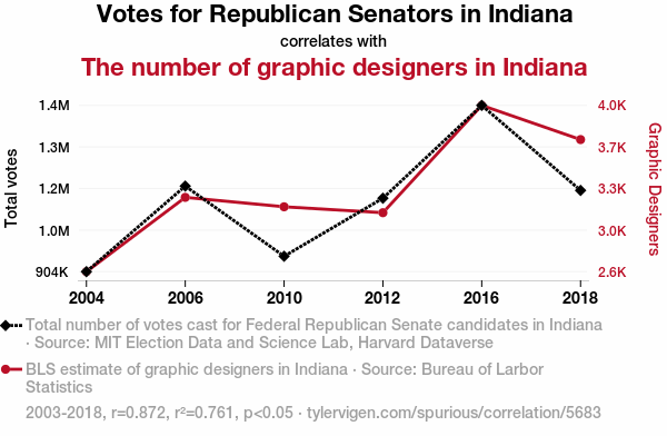This means 76.1% of the change in the one variable (i.e., The number of graphic designers in Indiana) is predictable based on the change in the other (i.e., Votes for Republican Senators in Indiana) over the 6 years from 2003 through 2018.
