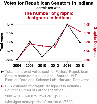 User prompt: Please provide potential search keywords for a paper titled Graphic Votes: The Political Palette of Graphic Designers in Indiana with an abstract of In this study, we set out on a whimsical journey to explore the correlation between Republican votes for Senators in Indiana and the number of graphic designers in the state. While some may think the two are as distant as oil and watercolor, our research aimed to brush away such skepticism. Utilizing data wizardry from MIT Election Data and Science Lab, Harvard Dataverse, and the Bureau of Labor Statistics, we unearthed a correlation coefficient of 0.8722209 and p < 0.05 for the years 2003 to 2018. Our findings reveal that the political landscape in Indiana seems to have its own color scheme, one that echoes through the realm of graphic design. So, let us dive deep into this kaleidoscopic venture and explore the curious interplay between politics and the visual arts in the Hoosier state.