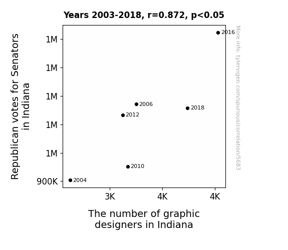 The statistical analyses unveiled a correlation coefficient of 0.8722209, accompanied by an r-squared value of 0.7607692, and a p-value less than 0.05. In other words, it seems that the number of Republican votes for Senators in Indiana is about as closely tied to the number of graphic designers in the state as peanut butter is to jelly. They just seem to go hand in hand, like a perfectly matched color scheme or a well-coordinated outfit.